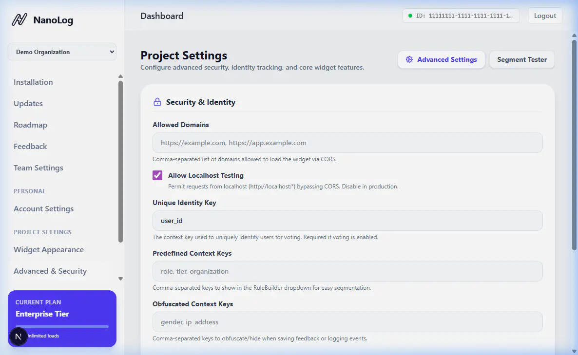 NanoLog uses a secure mechanism to authenticate users across domains, allowing you to uniquely identify your active logged-in users inside the widget without relying on third-party cookies or cross-site tracking. This is crucial for segmentation, identifying who is voting, and providing context for feedback.