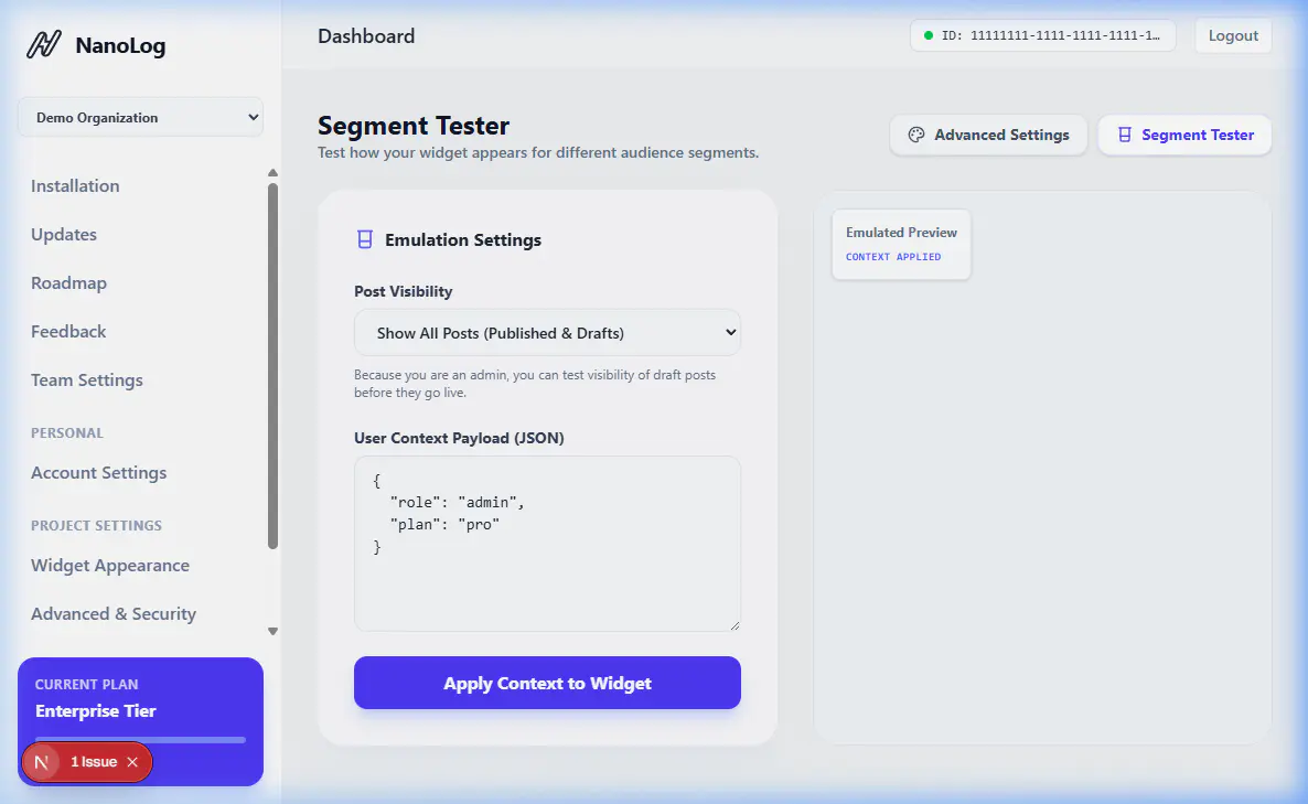Before you can segment posts, you must define the "Context Keys" that your application uses. These are properties about your users that you will pass to the widget upon initialization (e.g., plan, role, language).